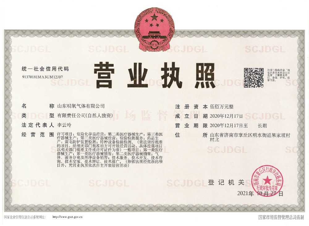 ??? 山東明氧氣體有限公司的前身為始建于1993年的章丘市明水氧氣廠,2020年12月企業由民營獨資轉型升級為山東明氧氣體有限公司,企業進入新的發展階段。公司位于山東省濟南市章丘區明水街道杲家坡村村北,占地面積4000平方米,注冊資金500萬元,固定資產投資3000萬元,主要經營項目為醫用氧氣、工業氧氣、氮氣、高純氮氣、氬氣、高純氬氣、高純氦氣、二氧化碳、混合氣體等各種工業氣體、高純氣體、混合氣體的充裝銷售、各類氣瓶的銷售、安全閥校驗、鋼質無縫氣瓶的檢驗等。